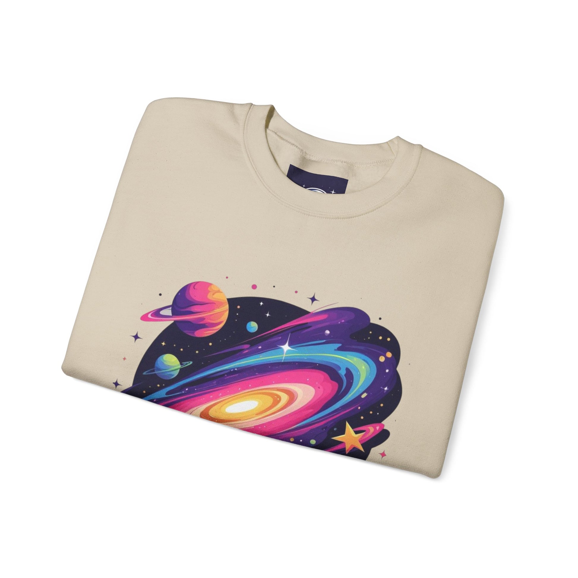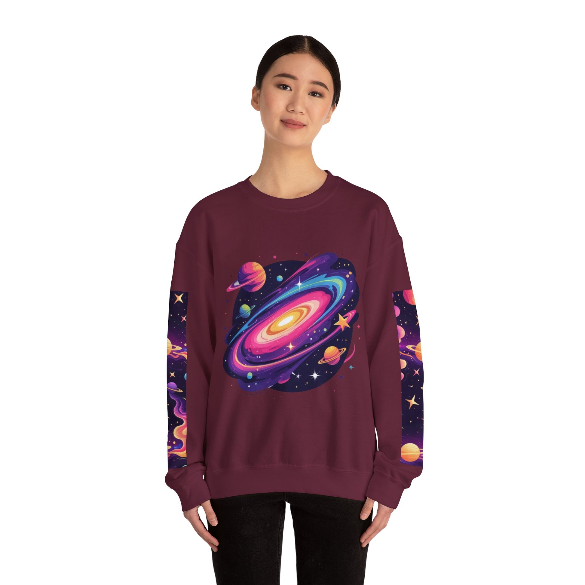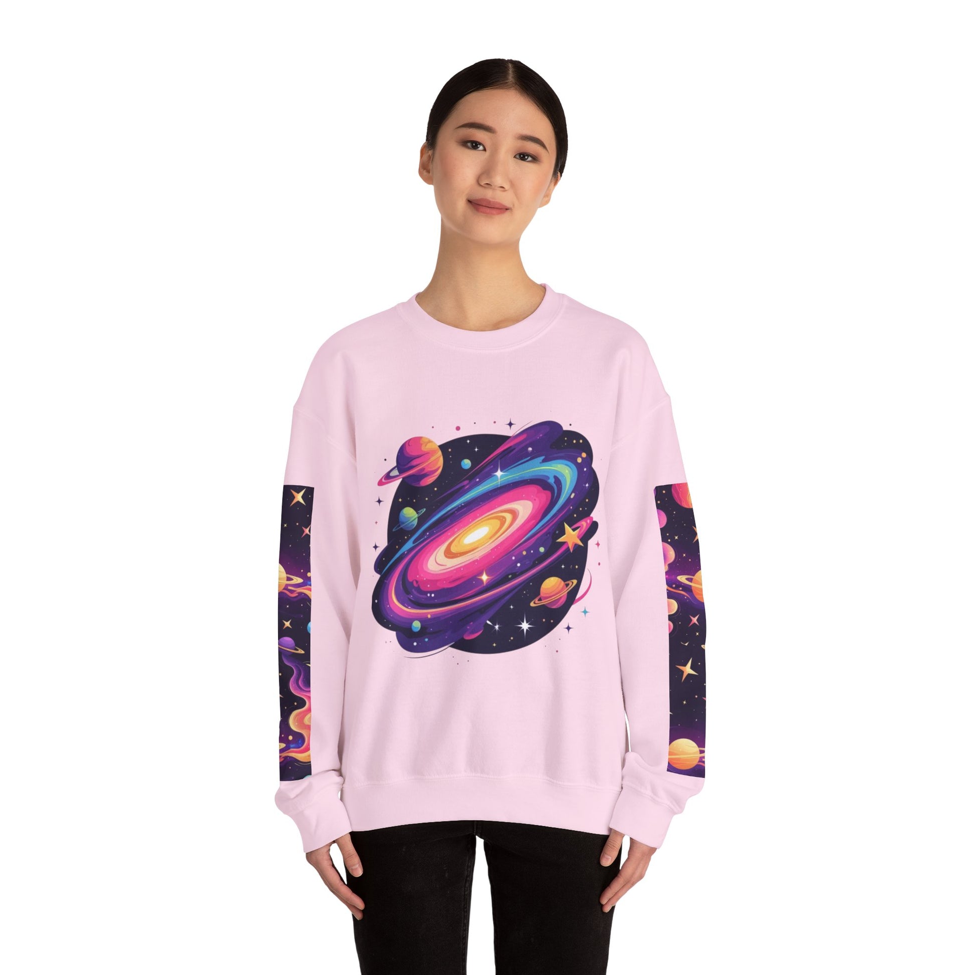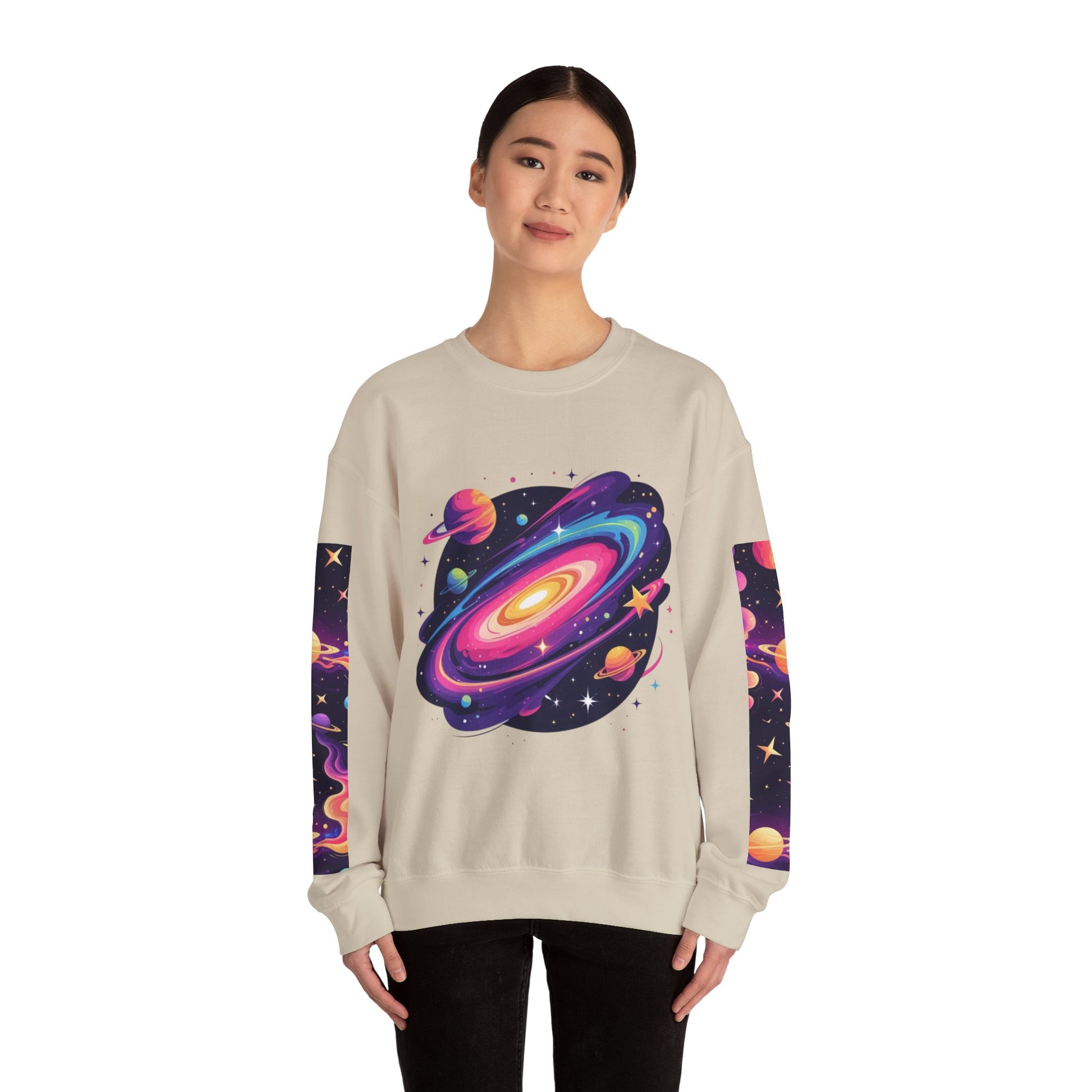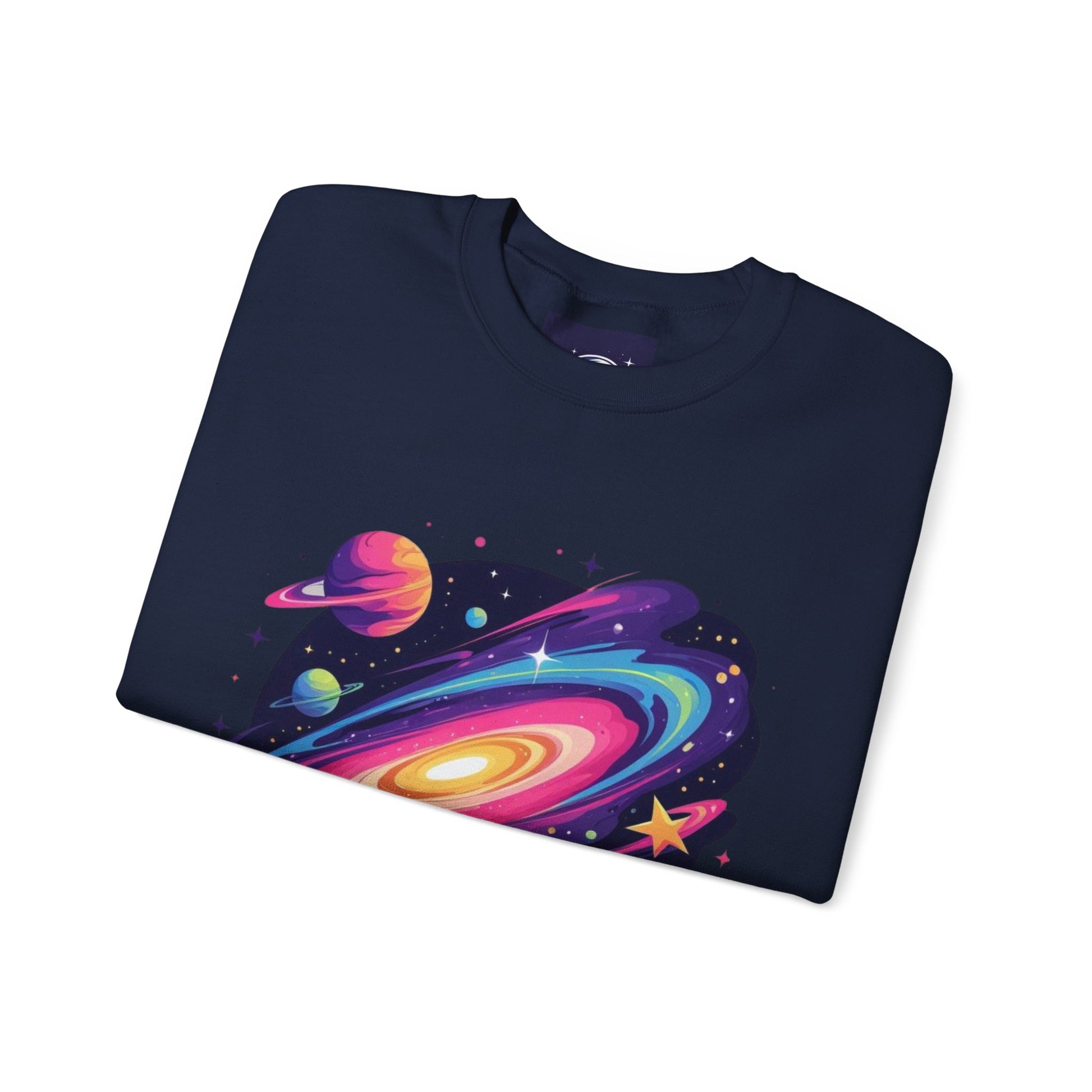 A cozy crewneck sweatshirt that brings a vivid, cosmic energy to everyday wear. Soft yet sturdy, the mid-weight blend holds bright DTG prints and embroidered accents without losing shape. The front and back showcase swirling, neon-galaxy artwork while complementary sleeve panels extend the space theme down the arms. Wear it on late-night stargazing runs, creative studio days, or relaxed city strolls — it sits comfortably in the middle of style and function, letting the artwork do the talking while you stay warm and confident.