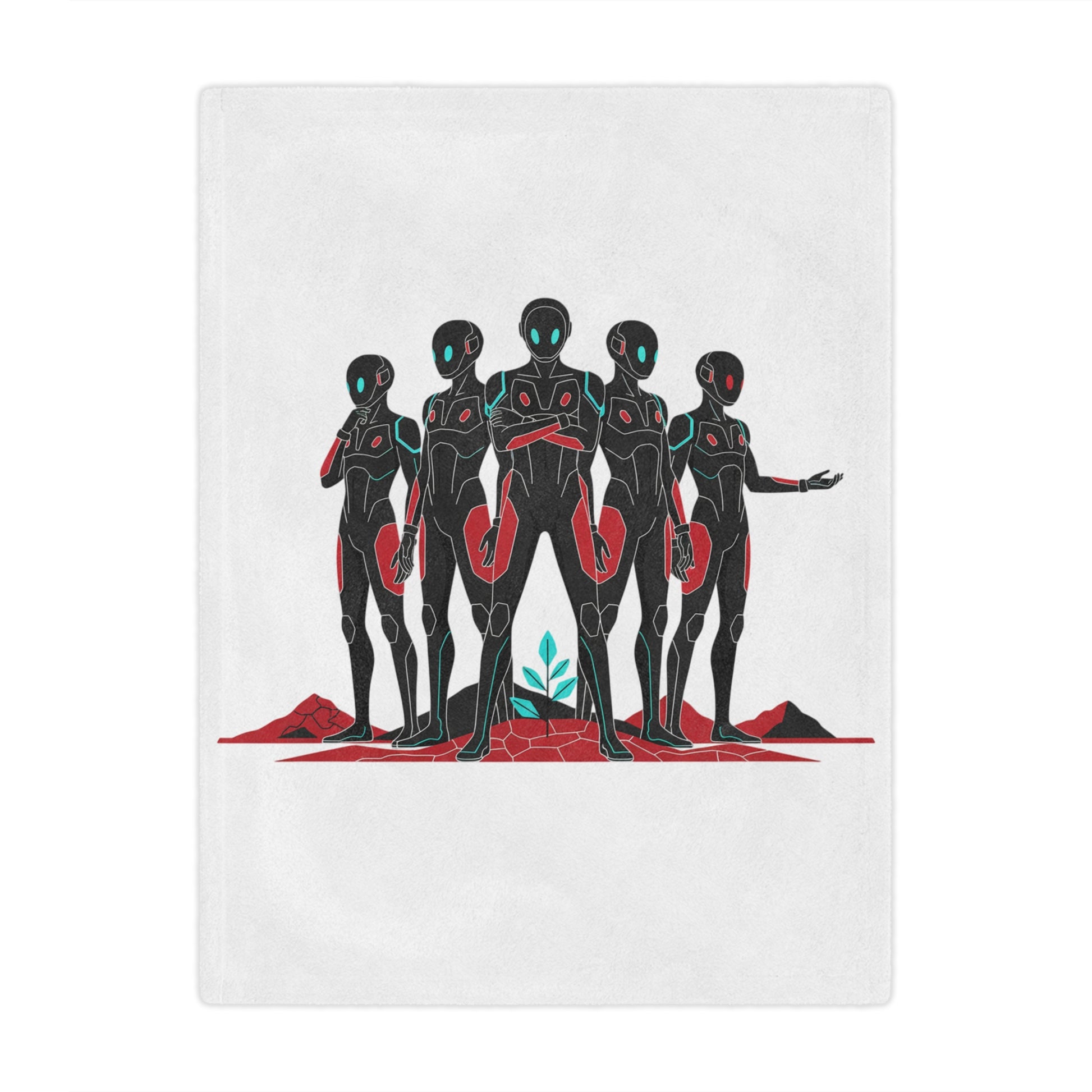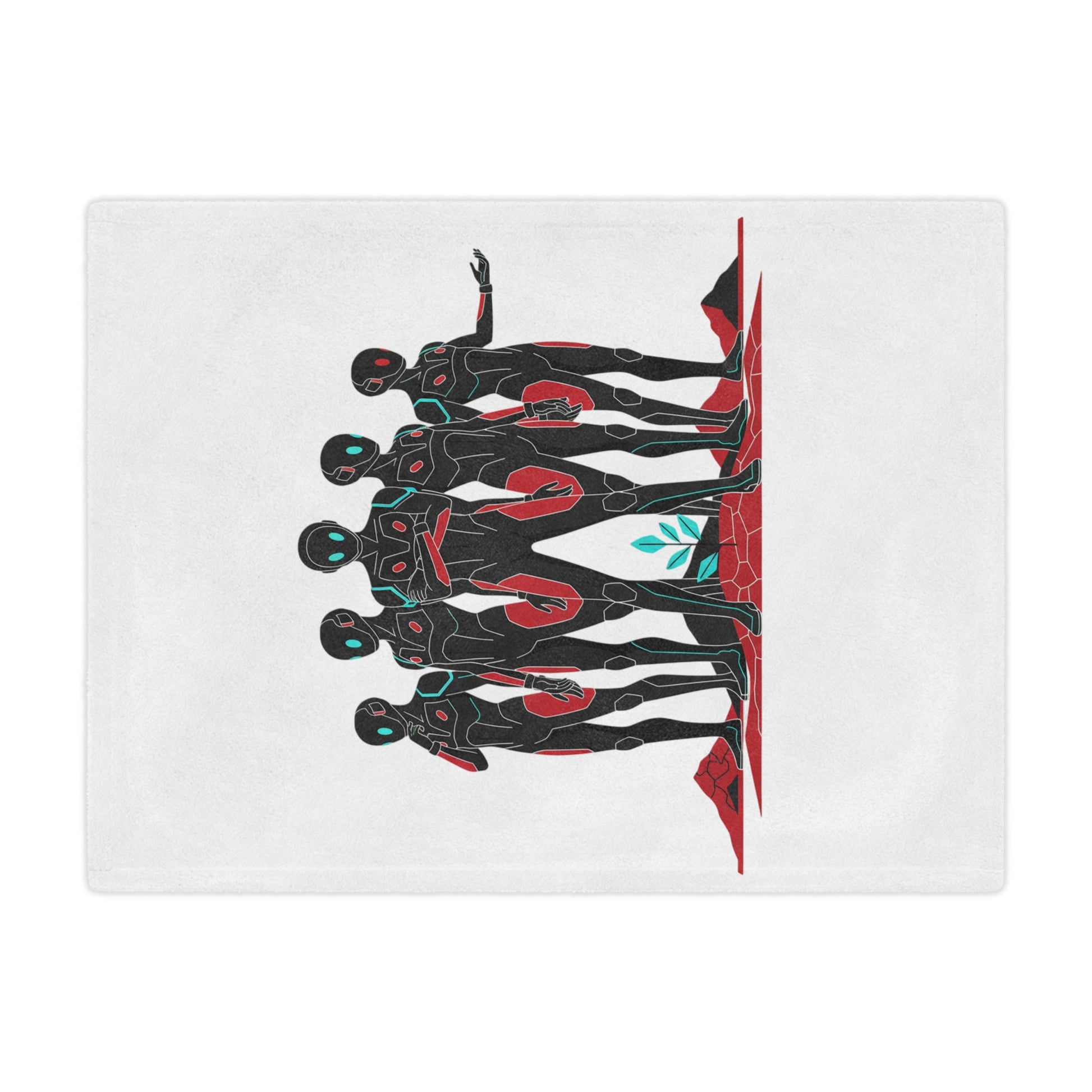 Wrapped in a soft, cloud-like plush, this minky blanket carries a quiet, futuristic pulse. Five sleek figures stand together across a minimalist landscape—black silhouettes outlined with red accents and teal highlights—inviting a feeling of calm unity and subtle mystery. Hold it while reading late-night sci-fi, drape it over a couch to anchor an edgy living space, or use it on cool evenings when you want warmth without weight. The one-sided print keeps the artwork crisp and bold against the gentle white background, so the design reads like a small, wearable story every time you pull the blanket close.